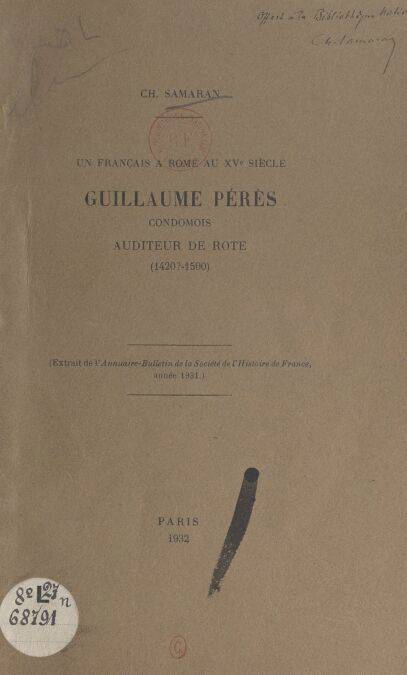 Guillaume Pérès est né - a priori - en 1420, à Condom, d’une très vieille et très noble famille. Après une brillante carrière à Rome, le prélat devint, à un peu plus de quarante ans, professeur à la prestigieuse Université de Bologne, l’une des plus célèbres de l’Europe à l'époque. Mais les documents font défaut, et l'on sait qu'il fut ensuite nommé auditeur de rote, une fonction qu'il occupa pendant vingt-quatre ans. Le tribunal de la Rote, juridiction de première instance et d’appel (principalement en matière bénéficiale), faisait alors l’admiration de la chrétienté. Voici donc l'histoire de Guillaume Pérès, brossée par Charles Samaran et suivie de son Oraison funèbre (texte latin et traduction) par Raffaello Brandolini.