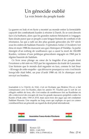 La guerre en Irak et en Syrie a montré au monde entier la formidable capacité des combattants kurdes à résister à Daesh. Ils se sont dressés face à la barbarie, alors que les grandes nations hésitaient à s'engager. Sans doute parce que ce peuple a une longue histoire de combats et de résistance, lui qui a subi un des plus grands génocides du XXe siècle sous les ordres de Saddam Hussein: l'opération Anfal. L'Occident s'est ému en mars 1988 du massacre aux gaz chimiques d'Halabja: la partie émergée d'un iceberg de souffrances qui a causé la mort de 182.000 Kurdes, victimes d'une politique génocidaire engagée en 1968 par le régime baasiste de Saddam. Ce livre nous plonge au coeur de la tragédie d'un peuple dont l'existence a été niée en 1923 par les signataires du traité de Lausanne. Une histoire que le monde doit regarder en face, comme le fait Snur - fil rouge de cette enquête - qui découvre pourquoi sa voix s'est brisée lorsqu'elle était bébé, un jour d'août 1988 où Ali le chimique avait envoyé ses bombes.