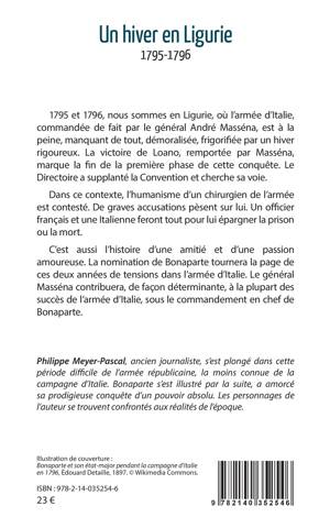 1795 et 1796, nous sommes en Ligurie, où l'armée d'Italie, commandée de fait par le général André Masséna, est à la peine, manquant de tout, démoralisée, frigorifiée par un hiver rigoureux. La victoire de Loano, remportée par Masséna, marque la fin de la première phase de cette conquête. Le Directoire a supplanté la Convention et cherche sa voie. Dans ce contexte, l'humanisme d'un chirurgien de l'armée est contesté. De graves accusations pèsent sur lui. Un officier français et une Italienne feront tout pour lui épargner la prison ou la mort. C'est aussi l'histoire d'une amitié et d'une passion amoureuse. La nomination de Bonaparte tournera la page de ces deux années de tensions dans l'armée d'Italie. Le général Masséna contribuera, de façon déterminante, à la plupart des succès de l'armée d'Italie, sous le commandement en chef de Bonaparte.