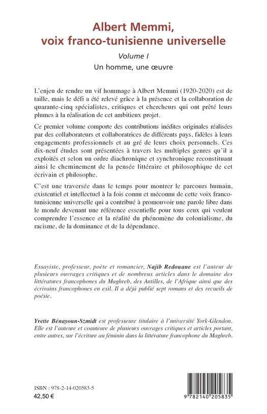 L’enjeu de rendre un vif hommage à Albert Memmi (1920-2020) est de taille, mais le défi a été relevé grâce à la présence et la collaboration de quarante-cinq spécialistes, critiques et chercheurs qui ont prêté leurs plumes à la réalisation de cet ambitieux projet. C’est une traversée dans le temps pour montrer le parcours humain, existentiel et intellectuel à la fois connu et méconnu de cette voix franco-tunisienne universelle qui a contribué à promouvoir une parole libre dans le monde devenant une référence essentielle pour tous ceux qui veulent comprendre l’essence et la réalité du phénomène du colonialisme, du racisme, de la dominance et de la dépendance.