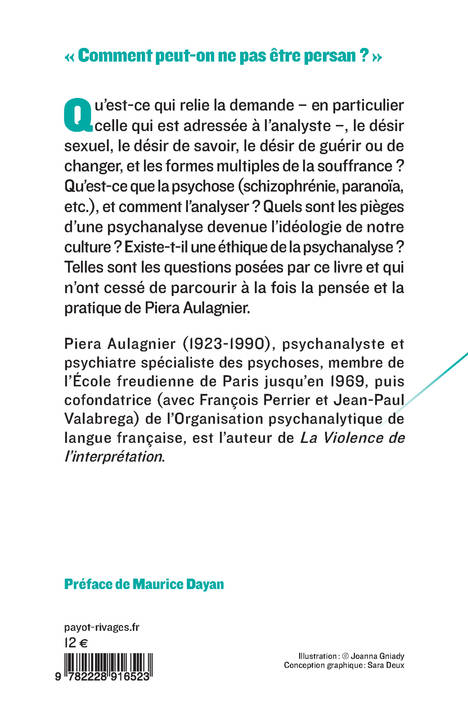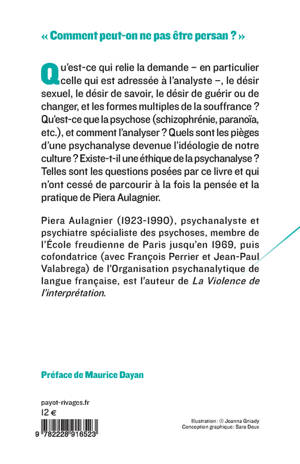 Qu'est-ce qui relie la demande - en particulier celle qui est adressée à l'analyste ‒, le désir sexuel, le désir de savoir, le désir de guérir ou de changer, et les formes multiples de la souffrance ? Qu'est-ce que la psychose (schizophrénie, paranoïa, etc.), et comment l'analyser ? Quels sont les pièges d'une psychanalyse devenue l'idéologie de notre culture ? Existe-t-il une éthique de la psychanalyse ? Telles sont les questions posées par ce livre et qui n'ont cessé de parcourir à la fois la pensée et la pratique de Piera Aulagnier.