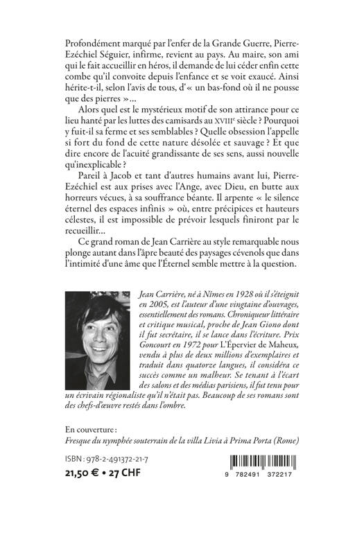 Profondément marqué par l’enfer de la Grande Guerre, Pierre-Ezéchiel Séguier, infirme, revient au pays. Au maire, son ami qui le fait accueillir en héros, il demande de lui céder enfin cette combe qu’il convoite depuis l’enfance et se voit exhaucé. Ainsi hérite-t-il, selon l'avis de tous, d'« un bas-fond où il ne pousse que des pierres »... Alors quel est le mystérieux motif de son attirance pour ce lieu hanté par les luttes des camisards au XVIIIe siècle ? Pourquoi y fuit-il sa ferme et ses semblables ? Quelle obsession l'appelle si fort du fond de cette nature désolée et sauvage ? Et que dire encore de l'acuité grandissante de ses sens, aussi nouvelle qu'inexplicable ? Pareil à Jacob et tant d'autres humains avant lui, Pierre-Ezéchiel est aux prises avec l'Ange, avec Dieu, en butte aux horreurs vécues, à sa souffrance béante. Il arpente « le silence éternel des espaces infinis » où, entre précipices et hauteurs célestes, il est impossible de prévoir lesquels finiront par le recueillir... Ce grand roman de Jean Carrière au style remarquable nous plonge autant dans l’âpre beauté des paysages cévenols que dans l’intimité d'une âme que l'Eternel semble mettre à la question