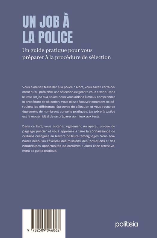 Vous aimeriez travailler à la police ? Alors, vous savez certainement qu’au préalable, une sélection exigeante vous attend. Dans le livre Travailler à la police, nous vous aidons à mieux comprendre la procédure de sélection. Vous allez découvrir comment se déroulent les différentes épreuves de sélection et vous recevrez également de nombreux conseils pratiques. Travailler à la police est le moyen idéal de se préparer au mieux aux tests.