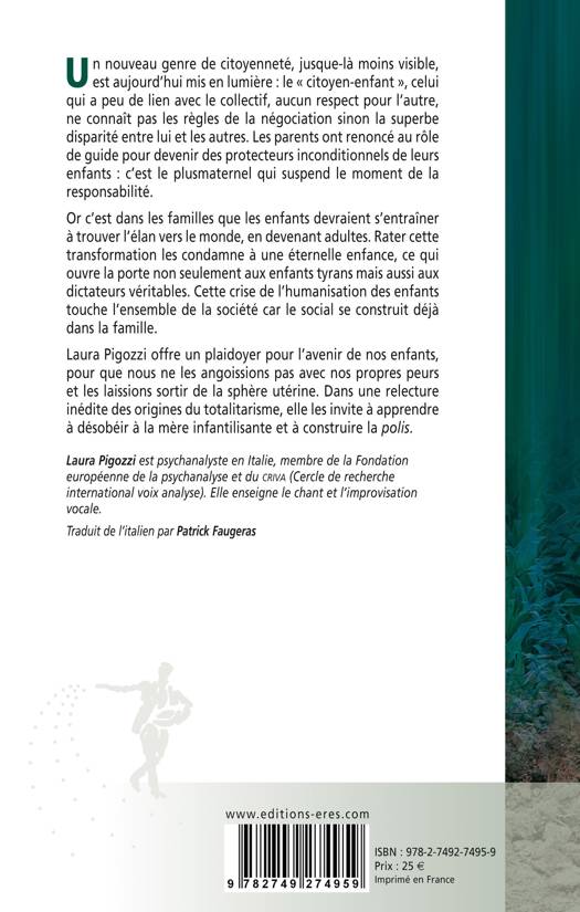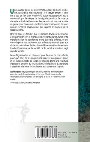 La pandémie a mis en exergue un nouveau genre de citoyenneté, jusque-là moins visible : le « citoyen-enfant », celui qui a peu de lien avec le collectif, aucun respect pour l’autre, ne connaît pas les règles de la négociation sinon la superbe disparité entre lui et les autres. Les parents ont renoncé au rôle de guide pour devenir des protecteurs inconditionnels de leurs enfants : c’est le plusmaternel qui suspend le moment de la responsabilité. Ainsi la famille, à l’origine de la civilisation, semble aujourd’hui ne plus assurer l’humanisation des enfants élevés en son sein. C’est une crise qui touche l’ensemble de la société car le social se construit déjà au sein de la famille. La génération qui a contesté élève des enfants et petits-enfants dociles, prêts à l’assujettissement. Que s’est-il passé ? Laura Pigozzi offre un plaidoyer pour l’avenir de nos enfants, pour que nous ne les angoissions pas avec nos propres peurs. Laissons-les partir hors de la sphère utérine. Car la subjectivité n’est pas qu’une affaire intime, elle ne peut exister qu’à travers le lien collectif : le reconnaître est déjà une révolution.