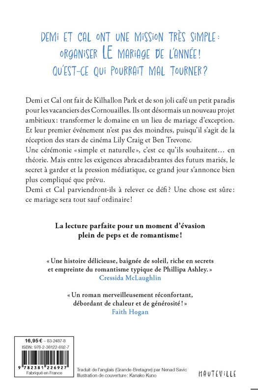 Demi et Cal ont fait de Kilhallon Park et de son joli café un petit paradis pour les vacanciers des Cornouailles. Mais leur nouveau projet est de taille : transformer le domaine en un lieu de mariage d'exception. Et leur premier événement n'est pas des moindres, puisqu'il s'agit de la réception des stars de cinéma Lily Craig et Ben Trevone. Une cérémonie « simple et naturelle », c'est ce qu'ils souhaitent... en théorie. Mais entre les exigences abracadabrantes des futurs mariés, le secret à garder et la pression médiatique, ce grand jour s'annonce bien plus compliqué que prévu. Demi et Cal parviendront-ils à relever ce défi ? Une chose est sûre : ce mariage sera tout sauf ordinaire !