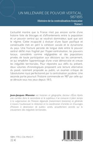 L’actualité montre que la France n’est pas encore sortie d’une histoire faite de blocages et d’affrontements entre la population et un pouvoir central qui se voudrait dominateur, quel que soit le régime. Cette incapacité à évoluer d’une façon pacifique et consensuelle met en péril la cohésion sociale et le dynamisme du pays. Une fracture persiste de longue date entre le pouvoir central déifié mais fragilisé par l’hyper-centralisation, les pouvoirs locaux, considérés comme négligeables et des populations privées de toute participation aux décisions qui les concernent, ce qui empêche l’apprentissage d’une vraie démocratie et creuse les inégalités territoriales. Pour répondre aux défis du présent, deux volumes chronologiques proposent une lecture alternative du passé, rarement proposée au public, un examen critique de l’absolutisme royal perfectionné par la centralisation jacobine. Une seconde partie poursuit l’histoire commencée en 987 par celle qui se déroule sous nos yeux depuis 1815.