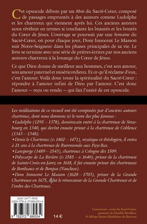 Cet opuscule débute par un Mois du Sacré-Cœur, composé de passages empruntés à des auteurs comme Ludolphe et les chartreux qui viennent après lui. Ces anciens auteurs nous révèlent en termes si touchants les beautés et les bontés du Cœur de Jésus. L’ouvrage se poursuit par une Semaine du Sacré-Cœur, où pour chaque jour, Dom Innocent Le Masson suit Notre Seigneur dans les phases principales de sa vie. Le livre se termine avec une série de prières écrites par nos anciens auteurs chartreux à la louange du Cœur de Jésus. Ce que Dieu donne de meilleur aux hommes, c’est son amour, son amour paternel et miséricordieux. Et ce qu’il réclame d’eux, c’est l’amour. Voilà donc toute la spiritualité du Sacré-Cœur : répondre à l’amour infini de Dieu par l’amour. C’est donc l’amour — reçu ou rendu — qui fait l’unité de cet opuscule.