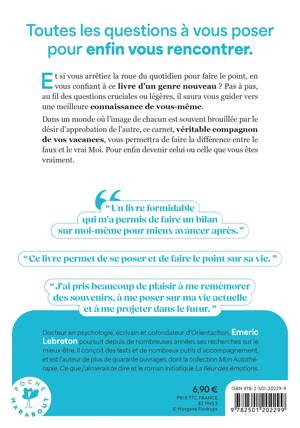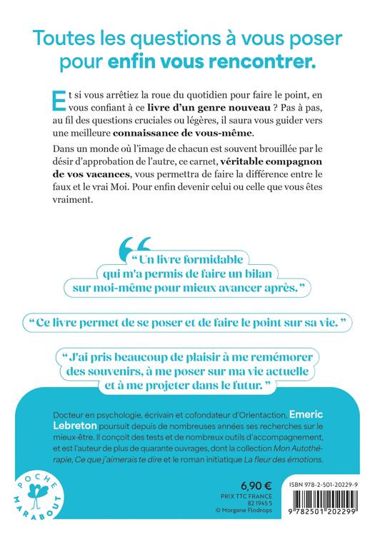 La vie est trop courte pour ne pas être soi-même, alors pourquoi ne pas commencer par savoir qui on est vraiment ? Le temps d’un été, Emeric Lebreton propose de faire le point, d’arrêter la roue du quotidien pour se confier à ce livre d'un genre nouveau, qui guidera pas à pas le lecteur vers une meilleure connaissance de lui-même. À travers cet ouvrage, l’auteur propose un exercice ludique et original pour faire la différence entre le faux et le vrai Moi, démarche qui se révèle essentiel dans un monde où l’image de chacun est souvent brouillée par un désir d'approbation de l'autre.