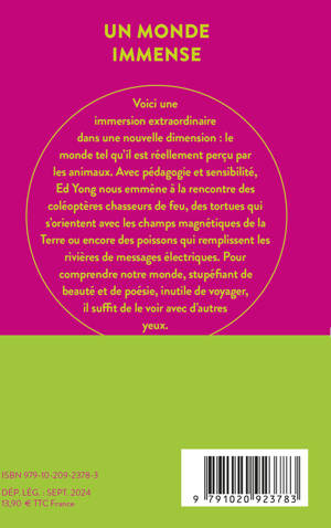 Voici un ouvrage évènement, bestseller du New York Times au succès mondial. Le lauréat du prix Pulitzer Ed Yong propose une immersion passionnante dans une nouvelle dimension : le monde tel qu'il est réellement perçu par les animaux. Un ouvrage qui émerveille et modifiera à jamais votre point de vue sur ce monde immense qui nous entoure.