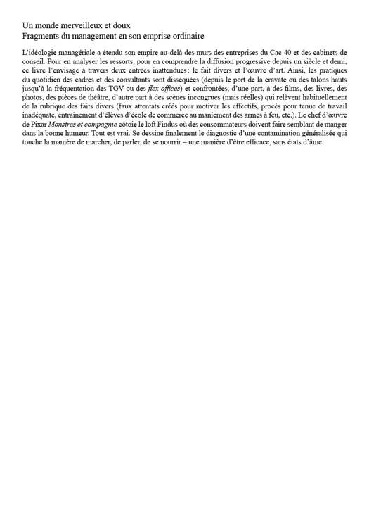 L'idéologie managériale a étendu son empire au-delà des murs des entreprises du Cac 40 et des cabinets de conseil. Pour en analyser les ressorts, pour en comprendre la diffusion progressive depuis un siècle et demi, ce livre l'envisage à travers deux entrées inattendues : le fait divers et l'oeuvre d'art. Ainsi, les pratiques du quotidien des cadres et des consultants sont disséquées (depuis le port de la cravate ou des talons hauts jusqu'à la fréquentation des TGV ou des flex offices) et confrontées, d'une part, à des films, des livres, des photos, des pièces de théâtre, d'autre part à des scènes incongrues (mais réelles) qui relèvent habituellement de la rubrique des faits divers (simulacres d'attentats créés pour motiver les effectifs, procès pour tenue de travail inadéquate, entraînement d'élèves d'école de commerce au maniement des armes à feu, entre autres). Le chef-d'oeuvre de Pixar Monstres et compagnie, côtoie le loft Findus où des consommateurs doivent faire semblant de manger dans la bonne humeur. Tout paraît faux mais tout est vrai. Se dessine finalement le diagnostic d'une contamination généralisée qui touche la manière de marcher, de parler, de se nourrir - une manière d'être efficace, sans états d'âme.
