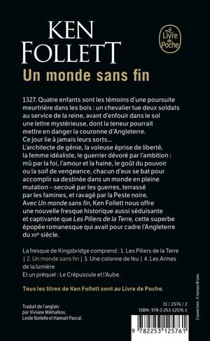1327. Quatre enfants sont les témoins d'une poursuite meurtrière dans les bois: un chevalier tue deux soldats au service de la reine, avant d'enfouir dans le sol une lettre mystérieuse, dont la teneur pourrait mettre en danger la couronne d'Angleterre. Ce jour lie à jamais leurs sorts... L'architecte de génie, la voleuse éprise de liberté, la femme idéaliste, le guerrier dévoré par l'ambition: mû par la foi, l'amour et la haine, le goût du pouvoir ou la soif de vengeance, chacun d'eux se bat pour accomplir sa destinée dans un monde en pleine mutation - secoué par les guerres, terrassé par les famines, et ravagé par la Peste noire. Avec Un monde sans fin, Ken Follett nous offre une nouvelle fresque historique aussi séduisante et captivante que Les Piliers de la Terre, cette superbe épopée romanesque qui avait pour cadre l'Angleterre du xiie siècle.Mème lieu, mème suspense, mème souffle.Le résultat est à la hauteur du pari: osé et réussi. Femmes.