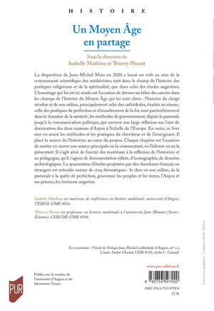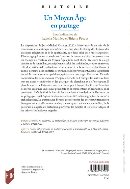 La disparition de Jean-Michel Matz en 2020 a laissé un vide au sein de la communauté scientifique des médiévistes, tant dans le champ de l’histoire des pratiques religieuses et de la spiritualité, que dans celui des études angevines. L’hommage qui lui est ici rendu est l’occasion de dresser un bilan des savoirs dans les champs de l’histoire du Moyen Âge qui lui sont chers : l’histoire du clergé séculier et de son milieu, principalement celui des cathédrales, étudiés en réseau ; celle des pratiques de perfection et d’encadrement de la foi, tout particulièrement dans le domaine de la sainteté ; les méthodes de gouvernement, depuis la pastorale jusqu’à la communication politique, qui ouvrent une large réflexion sur l’aire de domination des deux maisons d’Anjou à l’échelle de l’Europe. En outre, ce livre met en avant les méthodes et les pratiques du chercheur et de l’enseignant. Il place la source de l’historien au coeur du propos. Chaque chapitre est l’occasion de mettre en oeuvre une source principale en la commentant, en l’éditant ou en la présentant. Il s’agit ainsi de fournir des matériaux à la réflexion de l’historien et au pédagogue, qu’il s’agisse de documentation éditée, d’iconographie, de données archéologiques. La quarantaine d’études proposées par des chercheurs français ou étrangers est articulée autour de cinq thématiques : le clerc en son milieu, de la pastorale à la quête de perfection, gouverner les peuples et les terres, l’Anjou et ses princes, les horizons angevins.