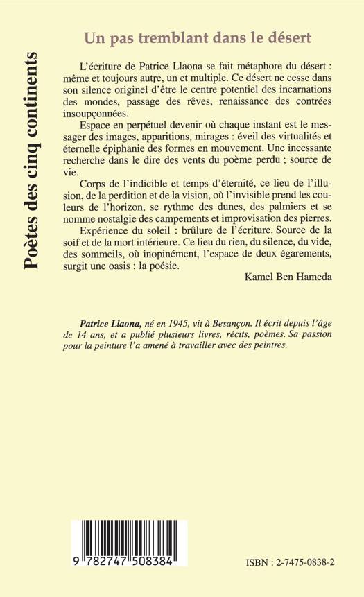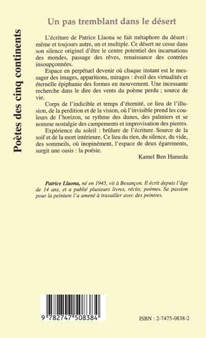 L'écriture de Patrice Llaona se fait métaphore du désert : même et toujours autre, un et multiple. Espace en perpétuel devenir ou chaque instant est le messager des images, apparitions, mirages. Corps de l'indicible et temps d'éternité, ce lieu de l'illusion, de la perdition et de la vision. Expérience du soleil : brûlure de l'écriture. Ce lieu du rien, du silence, du vide, des sommeils, où inopinément, l'espace de deux égarements, surgit une oasis : la poésie.