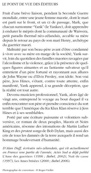Porté par une écriture puissante et volontiers subversive, ce roman de deux peuples, Maoris et Noirs américains, résonne des intonations de Martin Luther King et des« protest songs» de Bob Dylan, mais aussi des cris de tous les damnés de la terre auxquels il rend un hommage bouleversant d'humanité.
