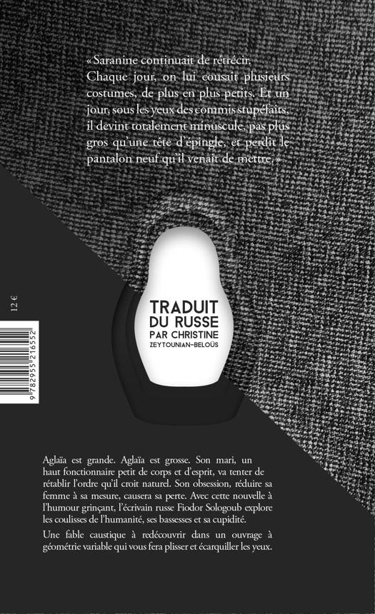 Aglaïa est grande. Aglaïa est grosse. Son mari, un haut fonctionnaire petit de corps et d'esprit, va tenter de rétablir l'ordre qu'il croit naturel. Son obsession, réduire sa femme à sa mesure, causera sa perte. Avec cette nouvelle à l'humour grinçant, l'écrivain russe Fiodor Sologoub explore les coulisses de l'humanité, ses bassesses et sa cupidité. Une fable caustique à redécouvrir dans un ouvrage à géométrie variable qui vous fera plisser et écarquiller les yeux.