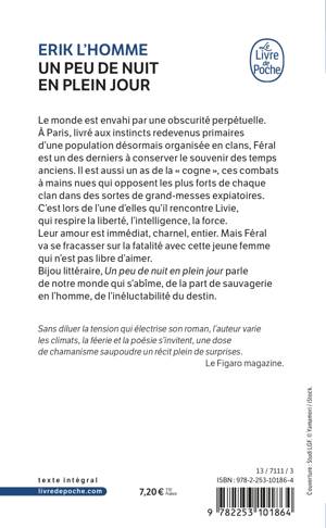 Paris est envahi par une obscurité perpétuelle et livré aux instincts redevenus primaires d’une population désormais organisée en clans. Dans ce monde urbain terriblement violent, Féral est un des derniers à conserver le souvenir des temps anciens. Il est aussi un as de la « cogne », ces combats à mains nues qui opposent les plus forts des clans dans des sortes de grand-messes expiatoires. C’est lors d’une de ces cognes qu’il rencontre Livie, qui respire la liberté, l’intelligence, la force. Leur amour est immédiat, charnel, entier. Mais le destin de Féral va se fracasser sur cette jeune femme qui n’est pas libre d’aimer.