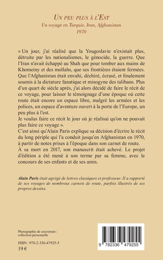 « Un jour, j’ai réalisé que la Yougoslavie n’existait plus, détruite par les nationalismes, le génocide, la guerre. Que l’Iran n’avait échappé au Shah que pour tomber aux mains de Khomeiny et des mollahs, que ses frontières étaient fermées. Que l’Afghanistan était envahi, déchiré, écrasé, et finalement soumis à la dictature fanatique et misogyne des talibans. Plus d’un quart de siècle après, j’ai alors décidé de faire le récit de ce voyage, pour laisser le témoignage d’une époque où cette route était encore un espace libre, malgré les armées et les polices, un espace d’aventure ouvert à la porte de l’Europe, un peu plus à l’est. Je voulus faire ce récit le jour où je réalisai qu’on ne pouvait plus faire ce voyage ». C’est ainsi qu’Alain Paris explique sa décision d’écrire le récit du long périple qui l’a conduit jusqu’en Afghanistan en 1970, à partir de notes prises à l’époque dans son carnet de route. À sa mort en 2017, son manuscrit était achevé. Le projet d’édition a été mené à son terme par sa femme, avec le concours de ses enfants et de ses amis.