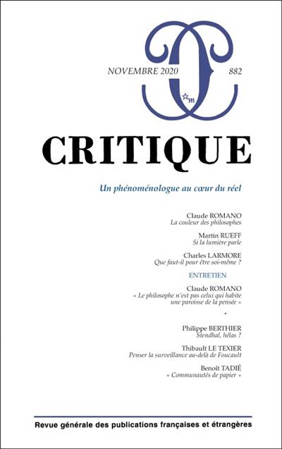 Claude Romano est l'homme des questions difficiles. Ce qu'illustrent ses plus récents ouvrages : Être soi-même. Une autre histoire de la philosophie et Les Repères éblouissants. Renouveler la phénoménologie ; ce qu'illustrera bientôt un autre livre, sur la couleur, à paraître en 2021. L'occasion était bonne de présenter son travail aux lecteurs de Critique : Martin Rueff l'a saisie pour nous.