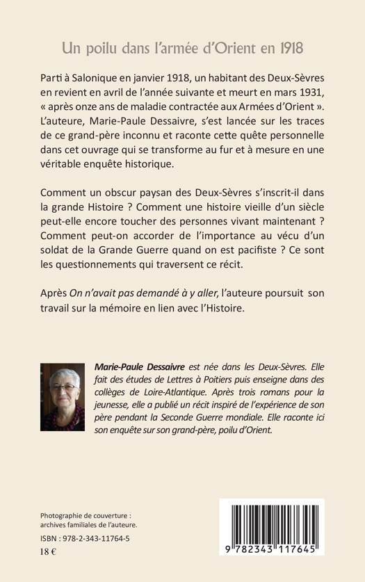 Parti à Salonique en janvier 1918, un habitant des Deux-Sèvres en revient en avril de l'année suivante et meurt en mars 1931 "après onze ans de maladie contractée aux Armées d'Orient". L'auteure s'est lancée sur les traces de ce grand-père inconnu et raconte cette quête personnelle dans cet ouvrage qui se transforme au fur et à mesure en une véritable enquête historique.