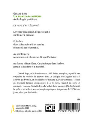 Un recueil de poèmes publiés entre 1975 et aujourd'hui, avec des inédits. Le difficile retour à la vie qu'accompagne le printemps après un rude hiver, lourd de souffrances ; chaque existence éphémère perdue dans l'histoire de l'humanité, en sont les thèmes principaux.