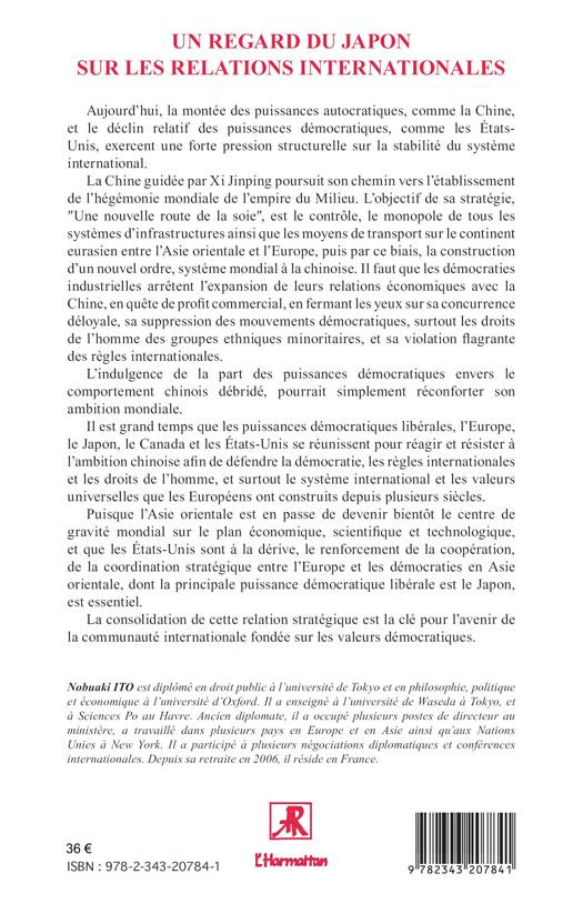 Aujourd'hui, la montée des puissances autocratiques, comme la Chine, et le déclin relatif des puissances démocratiques, comme les États-Unis, exercent une forte pression structurelle sur la stabilité du système international. L'objectif de la stratégie chinoise, par le biais de la "nouvelle route de la soie", est la construction d'un nouvel ordre mondial. L'indulgence de la part des puissances démocratiques envers le comportement chinois débridé (concurrence déloyale, violation des droits de l'homme notamment), pourrait simplement réconforter son ambition mondiale. Pour résister à l'ambition chinoise, l'auteur prône le renforcement de la coopération, de la coordination stratégique entre l'Europe et les démocraties en Asie orientale, dont la principale puissance démocratique libérale est le Japon. La consolidation de cette relation stratégique est la clé pour l'avenir de la communauté internationale fondée sur les valeurs démocratiques.