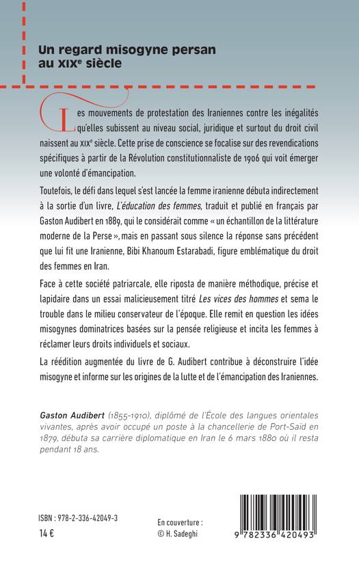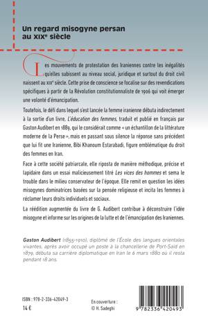 Les mouvements de protestation des Iraniennes contre les inégalités qu'elles subissent au niveau social, juridique et surtout du droit civil naissent au XIXe siècle. Cette prise de conscience se focalise sur des revendications spécifiques à partir de la Révolution constitutionnaliste de 1906 qui voit émerger une volonté d'émancipation. Toutefois, le défi dans lequel s'est lancée la femme iranienne débuta indirectement à la sortie d'un livre, L'éducation des femmes, traduit et publié en français par Gaston Audibert en 1889, qui le considérait comme un échantillon de la littérature moderne de la Perse, mais en passant sous silence la réponse sans précédent que lui fit une Iranienne, Bibi Khanoum Estarabadi, figure emblématique du droit des femmes en Iran. Face à cette société patriarcale, elle riposta de manière méthodique, précise et lapidaire dans un essai malicieusement titré Les vices des hommes et sema le trouble dans le milieu conservateur de l'époque. Elle remit en question les idées misogynes dominatrices basées sur la pensée religieuse et incita les femmes à réclamer leurs droits individuels et sociaux. La réédition augmentée du livre de G. Audibert contribue à déconstruire l'idée misogyne et informe sur les origines de la lutte et de l'émancipation des Iraniennes.