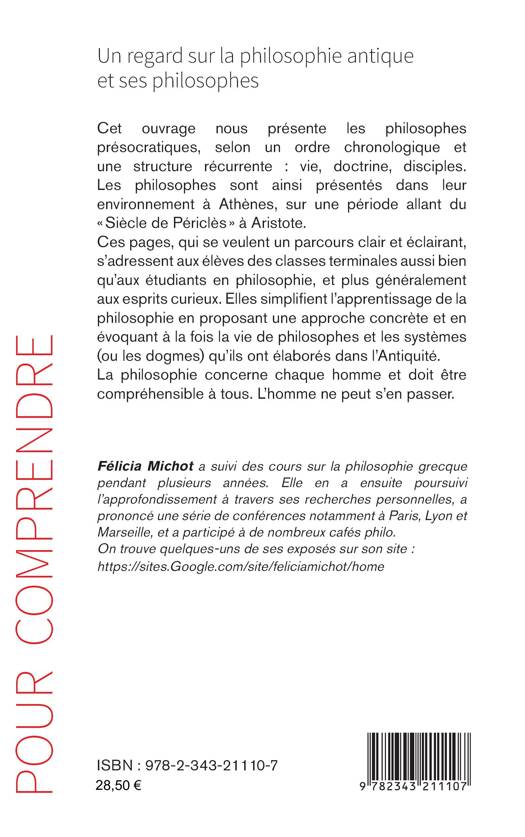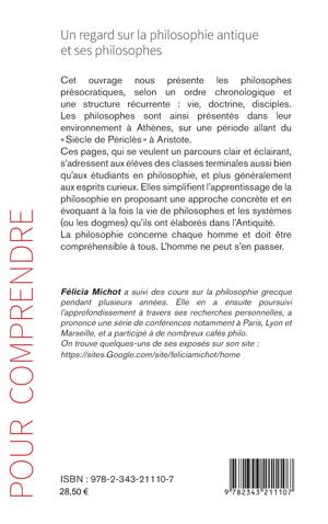 Cet ouvrage présente les philosophes présocratiques, selon un ordre chronologique et une structure récurrente: vie, doctrine, disciples. Les philosophes sont ainsi présentés dans leur environnement à Athènes, sur une période allant du Siècle de Périclès à Aristote. Ces pages, qui se veulent un parcours clair et éclairant, s'adressent aux élèves des classes terminales aussi bien qu'aux étudiants en philosophie, et plus généralement aux esprits curieux. Elles simplifient l'apprentissage de la philosophie en proposant une approche concrète et en évoquant à la fois la vie de philosophes et les systèmes (ou les dogmes) qu'ils ont élaborés dans l'Antiquité.
