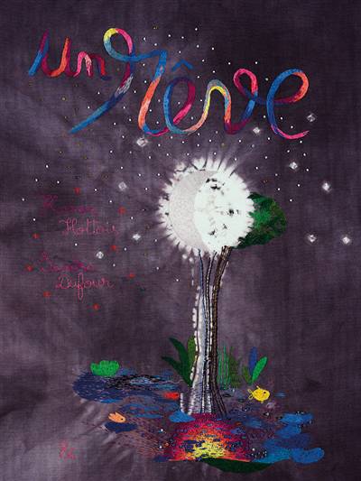 Sandra Dufour donne corps au rêve, en mêlant des tissus teintés selon la technique japonaise du shibori qui servent de support à ses broderies soigneusement réalisées. Le texte, brodé lui aussi, devient image. Le travail des couleurs, le contraste entre le tissu teinté et les couleurs vives de la broderie en font un chef d’œuvre pour les yeux !
