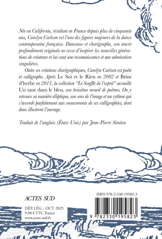 Née en Californie, résidant en France depuis plus de cinquante ans, Carolyn Carlson est l'une des figures majeures de la danse contemporaine française. Danseuse et chorégraphe, son oeuvre profondément originale ne cesse d'inspirer les nouvelles générations de créateurs et lui vaut une reconnaissance et une admiration singulières. Outre ses créations chorégraphiques, Carolyn Carlson est poète et calligraphe. Après Le Soi et le Rien en 2002 et Brins d'herbe en 2011, la collection "Le Souffle de l'esprit" accueille Un saut dans le bleu, son troisième recueil de poèmes. On y retrouve sa manière elliptique, son sens de l'image et un rythme qui s'accorde parfaitement aux mouvements de ses calligraphies, dont deux illustrent l'ouvrage.