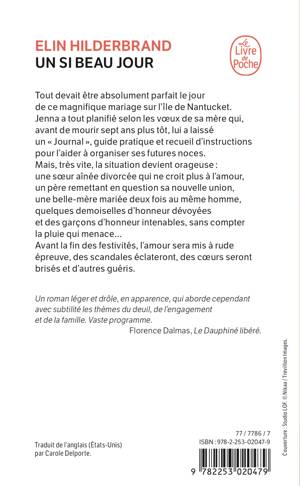 Tout devrait être absolument parfait le jour de ce magnifique mariage sur l'île de Nantucket. Jenna a tout planifié selon les vœux de sa mère qui, avant de mourir sept ans plus tôt, lui a laissé un « Journal », guide pratique et recueil d'instructions pour l'aider à organiser ses futures noces. Mais très vite, la situation devient orageuse : une sœur aînée divorcée qui ne croit plus à l'amour, un père remettant en question sa nouvelle union, une belle-mère mariée deux fois au même homme, quelques demoiselles d'honneur dévoyées – et des garçons d'honneur intenables –, sans compter la pluie qui menace... Avant la fin des festivités, l'amour sera mis à rude épreuve, des scandales éclateront, des cœurs seront brisés et d’autres guéris.