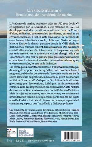L’Académie de marine, institution créée en 1752 sous Louis XV et supprimée par la Révolution, a été refondée en 1921. Le développement des questions maritimes dans la France d’alors, militaires, commerciales, juridiques, culturelles ou environnementales, a justifié cette renaissance. À l’occasion de ce centenaire, l’Académie a voulu, plutôt que d’écrire sa propre histoire, illustrer le chemin parcouru depuis le XVIIIe siècle, en particulier au cours de ces cent dernières années. Des évolutions considérables sont en effet intervenues. Les techniques de construction navale, d’observation océanique, de navigation, pour ne citer qu’elles, ont considérablement progressé, au bénéfice des acteurs de l’économie maritime, qu’ils soient armateurs ou pêcheurs, mais aussi au profit des marines militaires. Tous ont dû s’adapter à l’évolution de la situation géostratégique, économique, juridique, environnementale comme à celle des exigences sociétales nouvelles. Cette histoire du monde maritime se retrouve dans l’activité des académiciens. Mais le sujet est immense ; aussi cet ouvrage, volontairement limité dans son volume, l’est également par le nombre des sujets abordés. Certains font défaut, plus encore parce que la place était contrainte que parce que l’Académie y était peu présente.