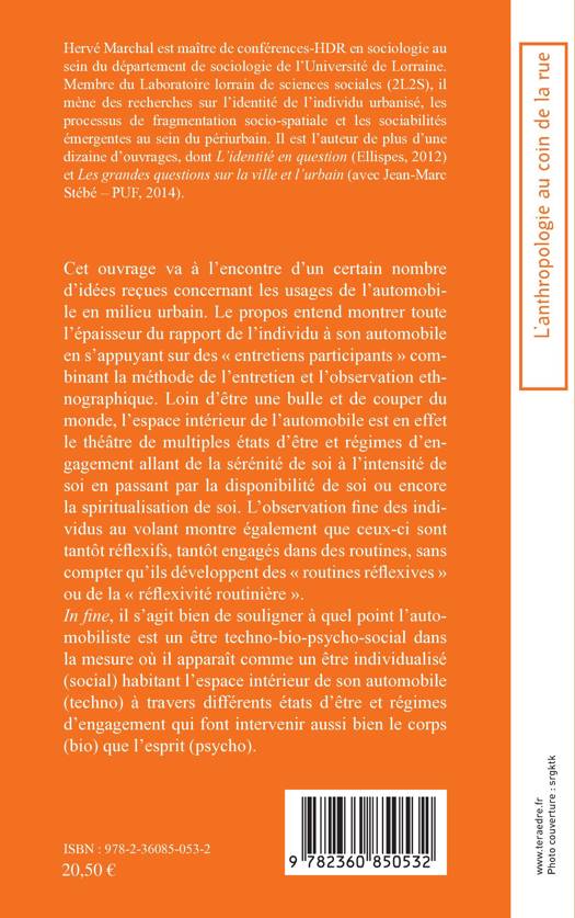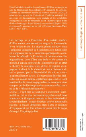 A partir d'"entretiens participants", comment comprendre le rapport de l'individu à son automobile ? L'automobiliste est un être techno-bio-psycho-social, dans la mesure où il apparaît comme un être individualisé (social), habitant l'espace intérieur de son automobile (techno) à travers différents états d'être et régimes d'engagement qui font intervenir aussi bien le corps (bio) que l'esprit (psycho).