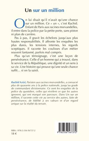 On lui disait qu'il n'avait qu'une chance sur un million. Ce un, c'est Rachid.Enfant de Paris aux racines morvandelles, il entre dans la police par la petite porte, sans piston ni plan de carrière. Pas à pas, il gravit les échelons jusqu'aux plus hautes responsabilités. Il affronte les enquêtes les plus dures, les tensions internes, les regards sceptiques. Il raconte les coulisses d'un métier souvent fantasmé, parfois mal compris. Plus qu'un témoignage, c'est une leçon de persévérance. Celle d'un homme qui a trouvé, dans le service de la République, une dignité et un sens à sa vie. Une histoire qui prouve qu'une seule chance suffit... si on la saisit.