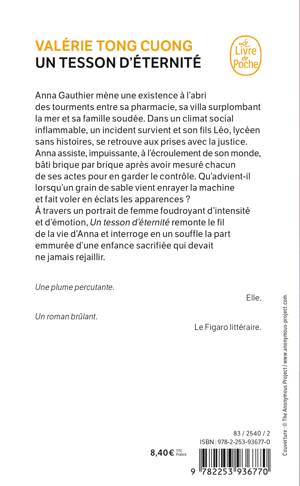 Anna Gauthier mène une existence à l’abri des tourments entre sa pharmacie, sa villa surplombant la mer et sa famille soudée. Dans un climat social inflammable, un incident survient et son fils Léo, lycéen sans histoire, se retrouve aux prises avec la justice. Anna assiste impuissante à l’écroulement de son monde, bâti brique après brique, après avoir mesuré chacun de ses actes pour en garder le contrôle. Qu’advient-il lorsqu’un grain de sable vient enrayer la machine et fait voler en éclats les apparences ? À travers un portrait de femme foudroyant d’intensité et d’émotion, Un tesson d’éternité remonte le fil de la vie d’Anna et interroge en un souffle la part emmurée d’une enfance sacrifiée qui devait ne jamais rejaillir.