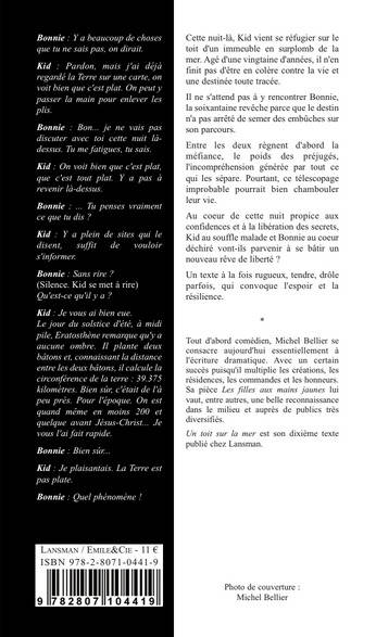 Cette nuit-là, Kid vient se réfugier sur le toit d'un immeuble en surplomb de la mer. Agé d'une vingtaine d'années, il n'en finit pas d'être en colère contre la vie et une destinée toute tracée. Il ne s'attend pas à y rencontrer Bonnie, la soixantaine revêche parce que le destin n'a pas arrêté de semer des embûches sur son parcours. Entre les deux règnent d'abord la méfiance, le poids des préjugés, l'incompréhension générée par tout ce qui les sépare. Pourtant, ce télescopage improbable pourrait bien chambouler leur vie. Au cœur de cette nuit propice aux confidences et à la libération des secrets, Kid au souffle malade et Bonnie au cœur déchiré vont-ils parvenir à se bâtir un nouveau rêve de liberté ? Un texte à la fois rugueux, tendre, drôle parfois, qui convoque l'espoir et la résilience.