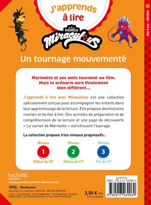 Marinette et ses amis tournent un film. Mais le scénario sera finalement bien différent… J’apprends à lire avec Miraculous est une collection spécialement conçue pour accompagner les enfants dans leur apprentissage de la lecture. Elle propose des histoires courtes et faciles à lire. Des activités de préparation et de compréhension de la lecture et une page de découverte « Le carnet de Marinette » enrichissent l’ouvrage.