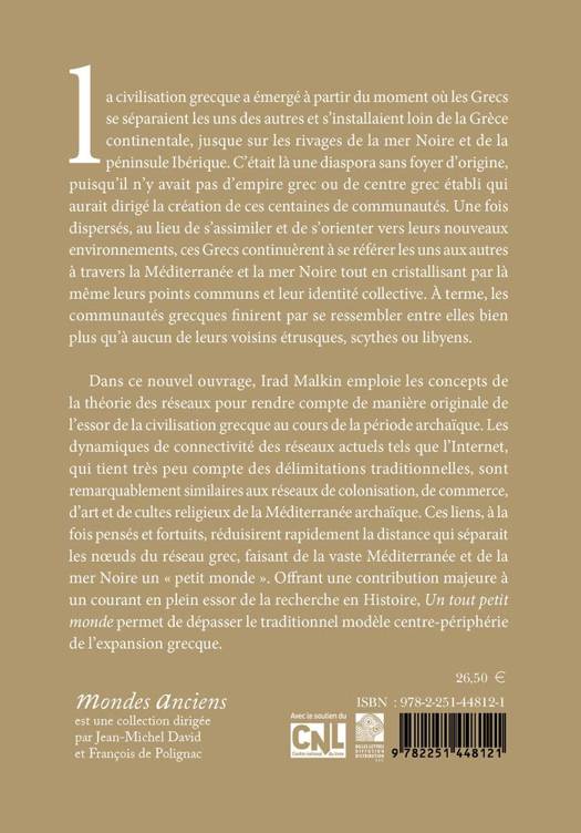 La civilisation grecque a emerge a partir du moment ou les Grecs se separaient les uns des autres et s'installaient loin de la Grece continentale, jusque sur les rivages de la mer Noire et de la peninsule Iberique. C'etait la une diaspora sans foyer d'origine, puisqu'il n'y avait pas d'empire grec ou de centre grec etabli qui aurait dirige la creation de ces centaines de communautes. Une fois disperses, au lieu de s'assimiler et de s'orienter vers leurs nouveaux environnements, ces Grecs continuerent a se referer les uns aux autres a travers la Mediterranee et la mer Noire tout en cristallisant par la meme leurs points communs et leur identite collective. A terme, les communautes grecques finirent par se ressembler entre elles bien plus qu'a aucun de leurs voisins etrusques, scythes ou libyens. Dans ce nouvel ouvrage, Irad Malkin emploie les concepts de la theorie des reseaux pour rendre compte de maniere originale de l'essor de la civilisation grecque au cours de la periode archaique. Les dynamiques de connectivite des reseaux actuels tels que l'Internet, qui tient tres peu compte des delimitations traditionnelles, sont remarquablement similaires aux reseaux de colonisation, de commerce, d'art et de cultes religieux de la Mediterranee archaique. Ces liens, a la fois penses et fortuits, reduisirent rapidement la distance qui separait les noeuds du reseau grec, faisant de la vaste Mediterranee et de la mer Noire un petit monde . Offrant une contribution majeure a un courant en plein essor de la recherche en Histoire, Un tout petit monde permet de depasser le traditionnel modele centre-peripherie de l'expansion grecque.