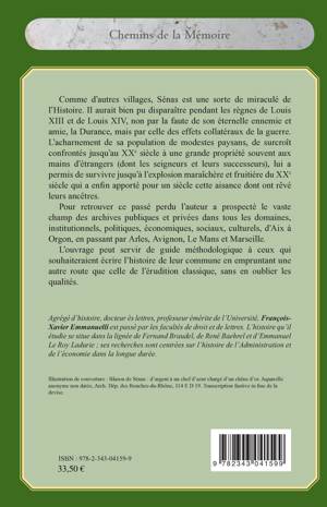 Sénas aurait bien pu disparaître pendant les règnes de Louis XIII et de Louis XIV à cause des effets collatéraux de la guerre. L'acharnement de sa population de modestes paysans lui a permis de survivre jusqu'à l'explosion maraîchère et fruitière du XXe siècle. L'auteur a prospecté les archives publiques et privées dans les domaines institutionnels, politiques, économiques, sociaux, culturels, d'Aix à Orgon en passant par Arles, Avignon, Le Mans et Marseille.