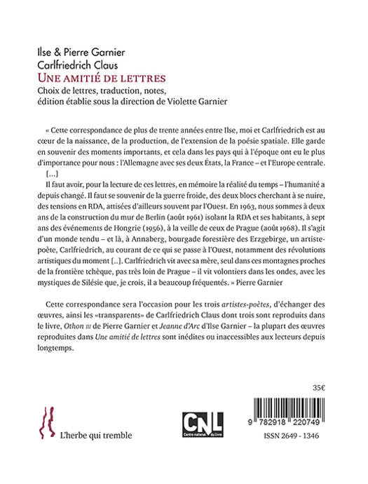 Artiste est-allemand, Carlfriedrich Claus s’est intéressé au spatialisme dès ses débuts. Ilse et Pierre Garnier et lui ne se sont rencontrés qu’une seule fois mais se sont écrits pendant plus de trente ans, de 1964 à 1998. Cette riche correspondance sera notamment l’occasion, pour les trois artistes-poètes, d’échanger des œuvres : ainsi les « transparents » de Carlfriedrich Claus, dont trois sont reproduits dans le livre, Othon III de Pierre Garnier et Jeanne d’Arc d’Ilse Garnier. La plupart des œuvres reproduites ici sont inédites ou inaccessibles aux lecteurs depuis longtemps.