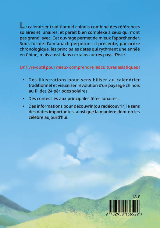 Le calendrier traditionnel chinois combine des références solaires et lunaires, et paraît bien complexe à ceux qui n'ont pas grandi avec. Cet ouvrage permet de mieux l'appréhender. Sous forme d'almanach perpétuel, il présente, par ordre chronologique, les principales dates qui rythment une année en Chine, mais aussi dans certains autres pays d'Asie.