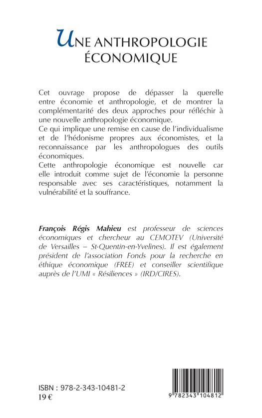 Cet ouvrage propose de dépasser la querelle entre économie et anthropologie, et de montrer la complémentarité des deux approches pour réfléchir à une nouvelle anthropologie économique. Ce qui implique une remise en cause de l'individualisme et de l'hédonisme propres aux économistes, et de la reconnaissance par les anthropologues des outils économiques. Cette anthropologie économique est nouvelle car elle introduit comme sujet de l'économie la personne responsable avec ses caractéristiques, notamment la vulnérabilité et la souffrance.