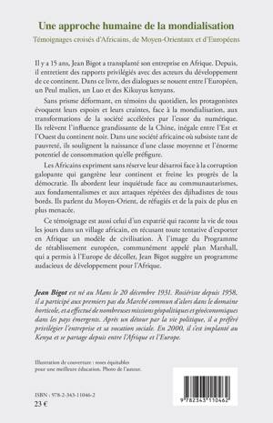 Il y a 15 ans, Jean Bigot a transplanté son entreprise en Afrique. Depuis, il entretient des rapports privilégiés avec des acteurs du développement de ce continent. Dans ce livre, des dialogues se nouent entre l'Européen, un Peul malien, un Luo et des Kikuyus kenyans. En témoins du quotidien, les protagonistes évoquent leurs espoirs et leurs craintes, face à la mondialisation, aux transformations de la société accélérées par l'essor numérique. Ils parlent du Moyen-Orient, de réfugiés et de la paix de plus en plus menacée. À l'image du plan Marshall qui a permis à l'Europe de décoller, l'auteur suggère un programme de développement pour l'Afrique.