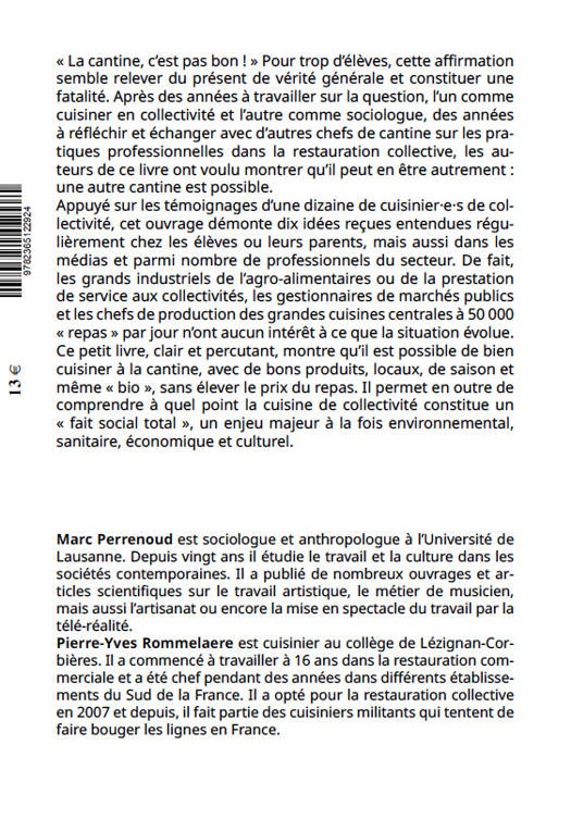 « La cantine, c’est pas bon ! » Pour trop d’élèves, cetteaffirmation semble relever du présent de vérité générale et constituer unefatalité. Après des années à travailler sur la question, l’un comme cuisiner encollectivité et l’autre comme sociologue, les auteurs de ce livre ont voulumontrer qu’il peut en être autrement : une autre cantine est possible. Cet ouvrage démonte dix idées reçues entendues régulièrement chez lesélèves ou leurs parents, mais aussi dans les médias et parmi nombre deprofessionnels du secteur. De fait, les grands industriels del’agro-alimentaires ou de la prestation de service aux collectivités, lesgestionnaires de marchés publics et les chefs de production des grandes cuisinescentrales à 50 000 « repas » par jour n’ont aucun intérêt à ce que la situationévolue. Ce petit livre, clair et percutant, montre qu’il estpossible de bien cuisiner à la cantine, avec de bons produits, locaux, de saisonet même « bio », sans élever le prix du repas.