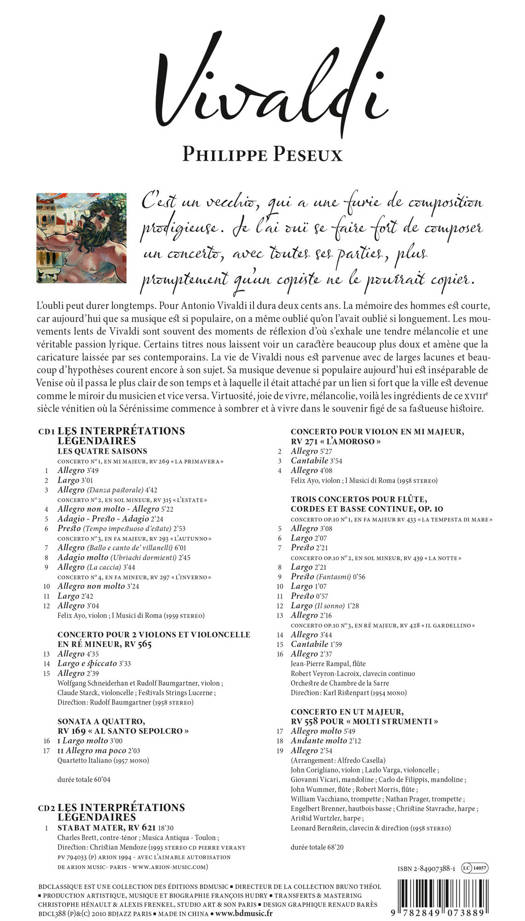 une biographie de Vivaldi, écrite par François Hudry, illustrée par Philippe Peseux, accompagnée de 2 compact discs.<br /><br /> DESSINS PHILIPPE PESEUX<br /> BIOGRAPHIE FRANCOIS HUDRY<br /><br /> 1 BANDE DESSINEE, <br /> 2 CD, 1 DISCOGRAPHIE<br /> 1 BIOGRAPHIE<br /><br /> EDITIONS : BDMUSIC<br /> DISTRIBUTION : POLLEN<br /> REF : BDC388 PRIX PUBLIC 20 €UROS<br /><br /> C’est un vecchio, qui a une furie de composition prodigieuse. Je l’ai ouï se faire fort de composer <br /> un concerto, avec toutes ses parties, plus promptement qu’un copiste ne le pourrait copier.<br /> Président de Brosses 1739<br /> L'oubli peut durer longtemps. Pour Antonio Vivaldi il dura deux cents ans. La mémoire des hommes est courte, car aujourd'hui que sa musique est si populaire, on a même oublié qu'on l'avait oublié si longuement. La musique d'Antonio Vivaldi passe souvent pour être uniquement joyeuse et superficielle. On se souvient du bon mot disant qu'il avait écrit cinq cents fois le même concerto. Toutefois il faut se méfier des clichés et des jugements à l'emporte pièce. Les mouvements lents de Vivaldi sont souvent des moments de réflexion d'où s'exhale une tendre mélancolie et une véritable passion lyrique. Certains titres nous laissent voir un caractère beaucoup plus doux et amène que la caricature laissée par ses contemporains. La vie de Vivaldi nous est parvenue avec de larges lacunes et beaucoup d'hypothèses courent encore à son sujet. A plusieurs reprises on perd sa trace. On ne sait rien non plus de ses goûts et de ses dégoûts. Mais sa musique devenue si populaire aujourd'hui est inséparable de Venise où il passa le plus clair de son temps et à laquelle il est était attaché par un lien si fort que la ville est devenue comme le miroir du musicien et vice versa. Virtuosité, joie de vivre, mélancolie, voilà les ingrédients de ce XVIIIe siècle vénitien où la Sérénissime commence à sombrer et à vivre dans le souvenir figé de sa fastueuse histoire. <br /> CD 1 Les Interprétations Légendaires<br /> Les Quatre Saisons Concerto n° 1, en mi majeur, <br /> 1 Allegro 2 Largo 3 Allegro (Danza pastorale) <br /> Concerto n° 2, en sol mineur, RV 315 « L’Estate » <br /> 4 Allegro non molto 5 Adagio - Presto 6 Presto - <br /> Concerto n° 3, en fa majeur, RV 293 « L’Autunno »<br /> 7 Allegro 8 Adagio molto 9 Allegro (La caccia) <br /> Concerto n° 4, en fa mineur, RV 297 « L’Inverno »<br /> 10 Allegro non molto 11 Largo 12 Allegro <br /> Felix Ayo, violon, I Musici di Roma<br /> Concerto pour 2 violons et violoncelle en ré mineur, RV <br /> 13 Allegro 14 Largo e spiccato 15 Allegro <br /> Direction : Rudolf Baumgartner<br /> Sonata a quattro, RV 169 « Al Santo Sepolcro »<br /> 16 I. Largo molto 17 II. Allegro ma poco 2:03 <br /> Quartetto Italiano<br /><br /> CD 2 Les Interprétations Légendaires<br /> 1 Stabat Mater, RV 621 18:30<br /> Direction : Christian Mendoze<br /> Concerto pour violon en mi majeur, RV 271 « l’Amoroso » <br /> 2 Allegro 3 Cantabile 4 Allegro <br /> Trois Concertos pour flûte, cordes et basse continue, op. 10 Concerto op. 10 n° 1, en fa majeur RV 433 « La <br /> 5 Allegro 6 Largo 7 Presto <br /> Concerto op. 10 n° 2, en sol mineur, RV 439 « La notte » <br /> 8 Largo 9 Presto 10 Largo 11 Presto <br /> 12 Largo (Il sonno) 13 Allegro <br /> Concerto op. 10 n° 3, en ré majeur, RV 428 « Il gardellino » <br /> 14 Allegro 15 Cantabile 16 Allegro <br /> Jean-Pierre Rampal, flûte, Robert Veyron-Lacroix, <br /> Concerto en ut majeur, RV 558 pour « molti strumenti » <br /> 17 Allegro molto 5:49<br /> 18 Andante molto 2:12<br /> 19 Allegro 2:54<br />