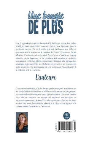 Une bougie de plus retrace la vie de Cécile Berger, issue d'un milieu privilégié, mais confrontée, comme chacun, aux épreuves que le quotidien impose. Ce récit révèle que nul n'échappe aux défis, et que notre avenir repose sur la manière dont nous choisissons de les affronter. L'auteure met en lumière l'importance d'examiner chaque situation, de se dépasser, et de constamment remettre en question ses propres certitudes. Dans ce parcours initiatique, elle partage ses stratégies pour surmonter les obstacles universels et les discussions qu'ils soulèvent. Ce témoignage est une invitation à l'identification, à la réflexion et à la résilience.