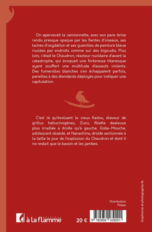 L’explosion de la centrale nucléaire de Courpigny, a précipité la chute du monde tel qu’on le connaissait, amenant son cortège de radiations et de mutations étranges. Autour d’une camionnette mangée par la rouille évoluent Kadou, éleveur de grillus hallucinogènes, Zuzu, fillette dealeuse plus irradiée à droite qu’à gauche, Gobe-Mouche, adolescent à problèmes et Nanachina, une demi-droïde réduite à un bassin et des jambes. Brice Tarvel signe là un roman post-apocalyptique rural, singulier, jubilatoire et épicé ; d’une poésie et d’une gouaille uniques en leur genre.