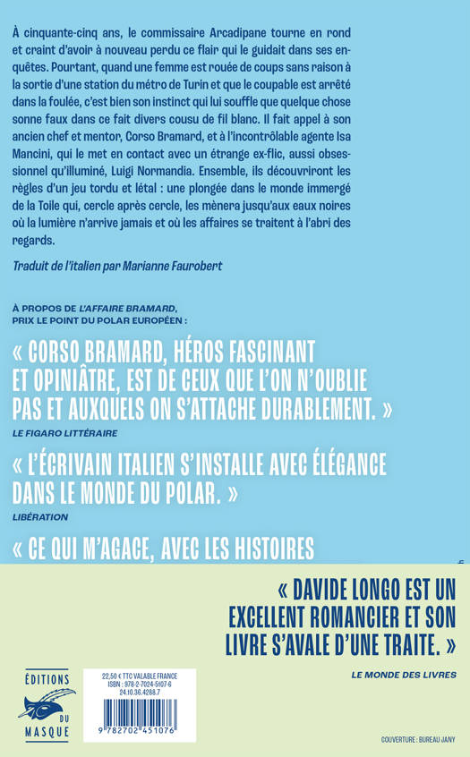 La vie en noir« Le récit – qui jusqu’ici louvoyait entre deux belles descriptions de Turin et les pittoresques mésaventures d’Arcadipane sur un site de rencontres – soudain s’accélère. Et trouve son rythme de croisière. Plus soudée que jamais, la fine équipe finit par découvrir la cause d’une série de suicides et de morts suspects: un jeu mortifère et pervers enfoui au plus profond d’Internet. Pas de doute, le dark web a ces temps-ci la cote au royaume du bon polar ! »