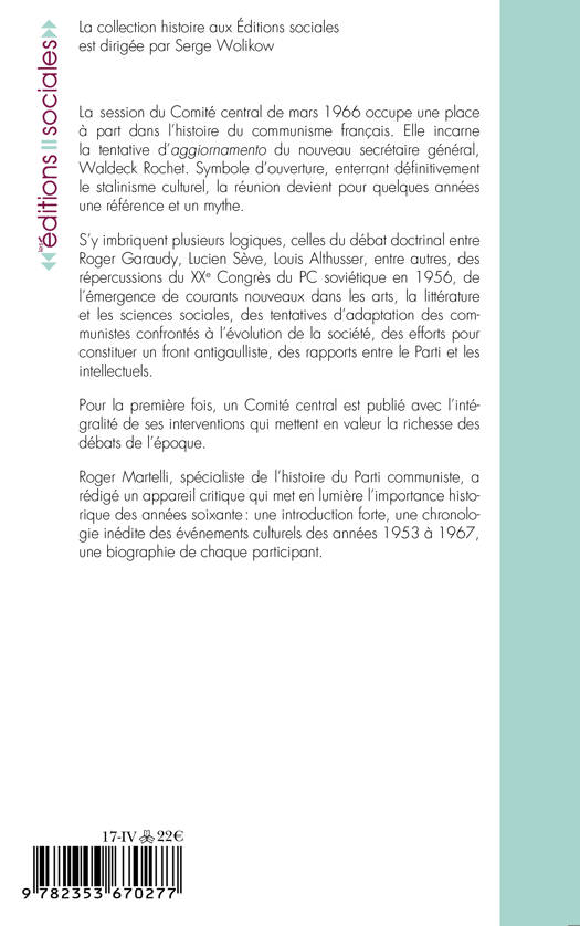 La session du Comité central de mars 1966 occupe une place à part dans l'histoire du communisme français. Elle incarne la tentative d'aggiornamento du nouveau secrétaire général, Waldeck Rochet. Symbole d'ouverture, enterrant définitivement le stalinisme culturel, la réunion devient pour quelques années une référence et un mythe. S'y imbriquent plusieurs logiques, celles du débat doctrinal entre Roger Garaudy, Lucien Sève, Louis Althusser, entre autres, des répercussions du XXe Congrès du PC soviétique en 1956, de l'émergence de courants nouveaux dans les arts, la littérature et les sciences sociales, des tentatives d'adaptation des communistes confrontés à l'évolution de la société, des efforts pour constituer un front antigaulliste, des rapports entre le Parti et les intellectuels. Pour la première fois, un Comité central est publié avec l'intégralité de ses interventions qui mettent en valeur la richesse des débats de l'époque.