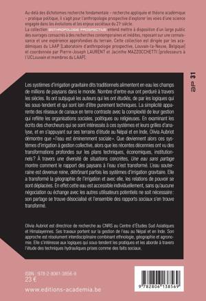 Les systèmes d'irrigation gravitaire dits traditionnels alimentent en eau les champs de millions de paysans dans le monde. Nombre d'entre eux ont perduré à travers les siècles. Ils ont subjugué les auteurs qui les ont étudiés, de par les logiques qui les sous-tendent et qui sont loin d'être purement techniques. La simplicité apparente des réseaux de canaux en terre contraste avec la complexité de leur gestion qui reflète les organisations sociales, politiques ou religieuses. En examinant les écrits des chercheurs qui se sont intéressés à ces systèmes et leurs grilles d'analyse, et en s'appuyant sur ses terrains d'étude au Népal et en Inde, Olivia Aubriot démontre que l'eau est éminemment sociale . Que deviennent alors ces systèmes d'irrigation à gestion collective, alors que les récentes décennies ont vu des transformations profondes sur les plans techniques, économiques, institutionnels ? À travers une diversité de situations concrètes, Une eau sans partage montre comment le rapport des paysans à l'eau s'est transformé. L'eau souterraine est devenue reine, détrônant parfois les systèmes d'irrigation gravitaire. Elle a transformé la géographie de l'irrigation et avec elle, les relations de pouvoir se sont déplacées. En effet cette eau est accessible individuellement, sans qu'aucune négociation ou échange avec les autres utilisateurs potentiels ne soit nécessaire: son partage se trouve désocialisé et l'ensemble des rapports sociaux s'en trouve transformé.