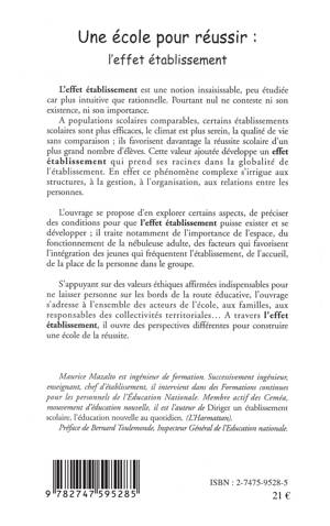 A populations scolaires comparables, certains établissements scolaires sont plus efficaces, le climat plus serein, la qualité de vie sans comparaison; ils favorisent davantage la réussite scolaire d'un plus grand nombre d'élèves. Cette valeur ajoutée développe un effet établissement qui prend ses racines dans la globalité de l'établissement. il s'agit ici d'en explorer certains aspects, de préciser des conditions pour que l'effet établissement puisse exister et se développer.